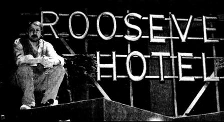 Ted standing outside of 3rd Floor window enjoying a martini while watching finishing installation of Filmworks theater marquee.