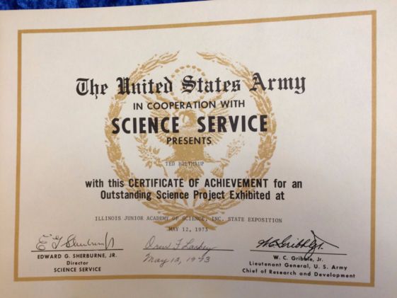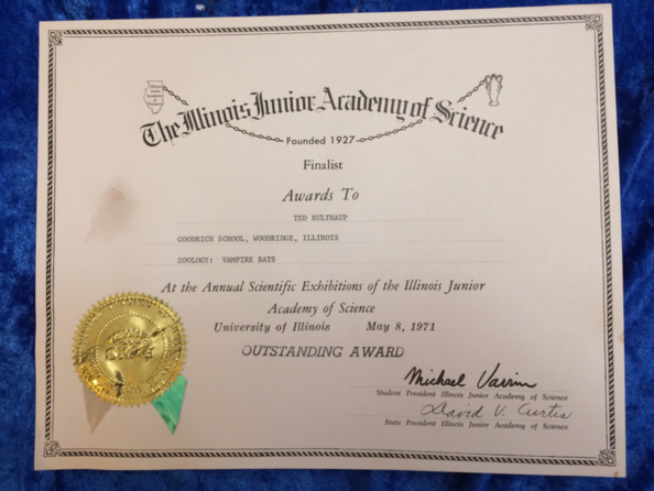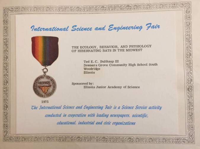 Interested in many things, especially American History, science and nature, Ted still holds the record for the most 1st Place Science Awards in the State of Illinois and, among other awards, won the International Science & Engineering First Prize for Zoology for his work on the biology of hibernating bats. Over 1,000,000 students were in the worldwide competition. He first worked with captive Vampire Bats at Brookfield Zoo in 7th grade and later had laboratory space and equipment at Argonne National Lab’s Biology Building donated for use in his work during his junior and senior years of High School.