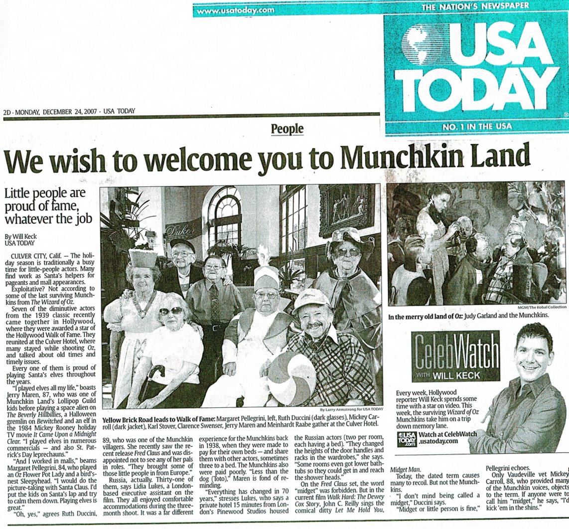 Star dedication and ceremony. They were Clarence Swenson, Jerry Maren, (top row) Karl Slover, Margaret Pelligrini (next row), Meinhardt Raabe, Ruth Ducini, (next row) and Mickey Carroll (bottom row). Jerry Maren who played the center Lollipop Kid is now the last remaining Munchkin. These pictures were taken by photographers sent by the Smithsonian Insitute the day before at the famed Hollywood Roosevelt Hotel, across the street from Grauman's Chinese Theater and where the ceremony took place. The Roosevelt was the site of the very first Academy Award Ceremony.